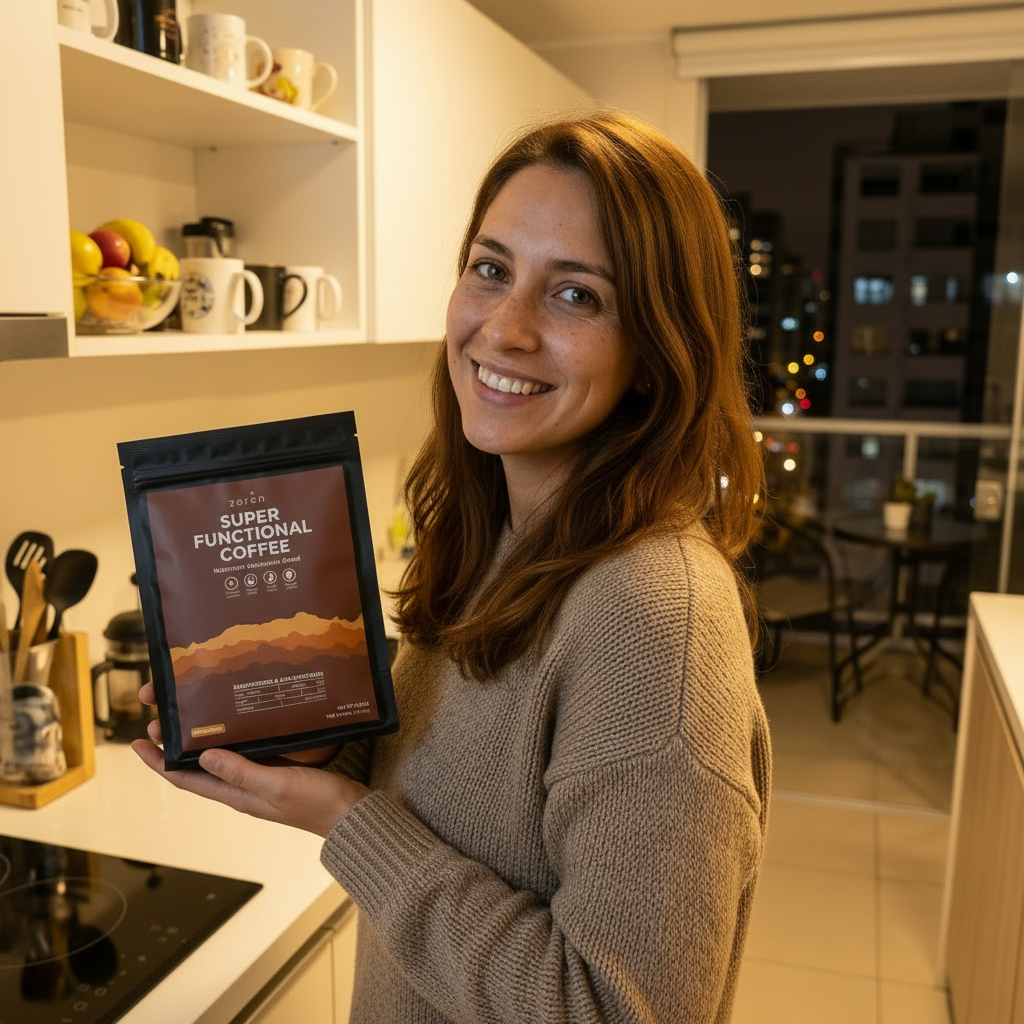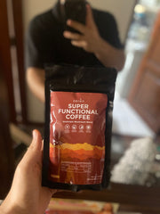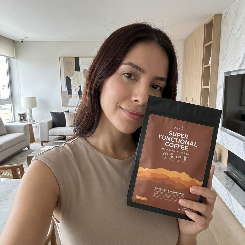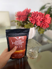 Agrega una cucharada de Super Functional Coffee a tu taza y añade agua caliente o fría (120–250 ml)